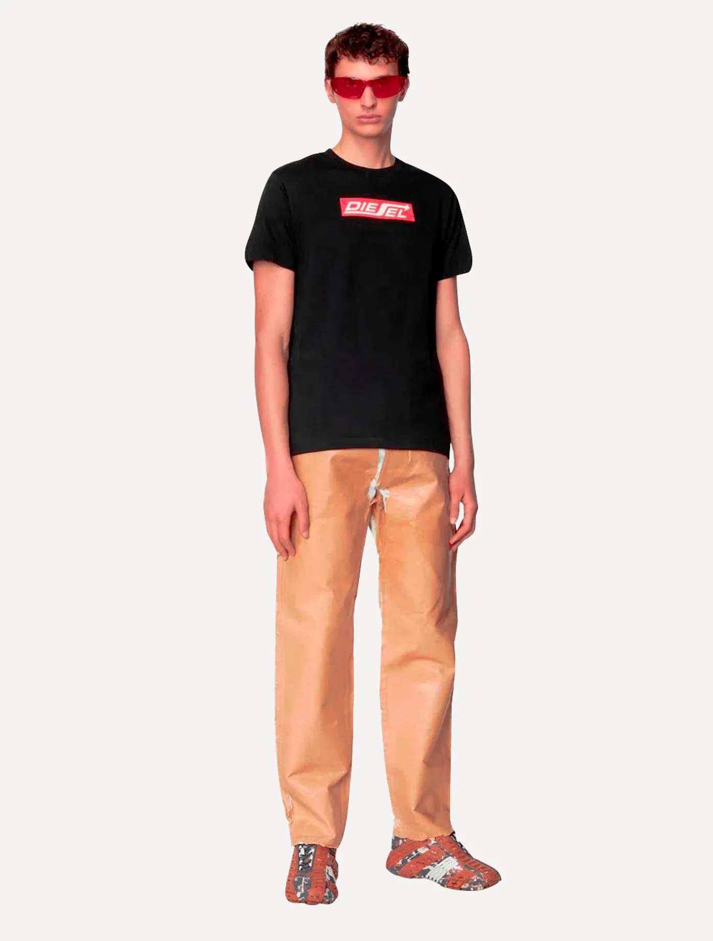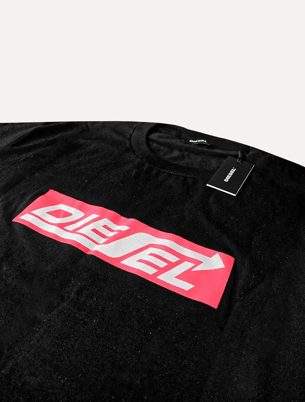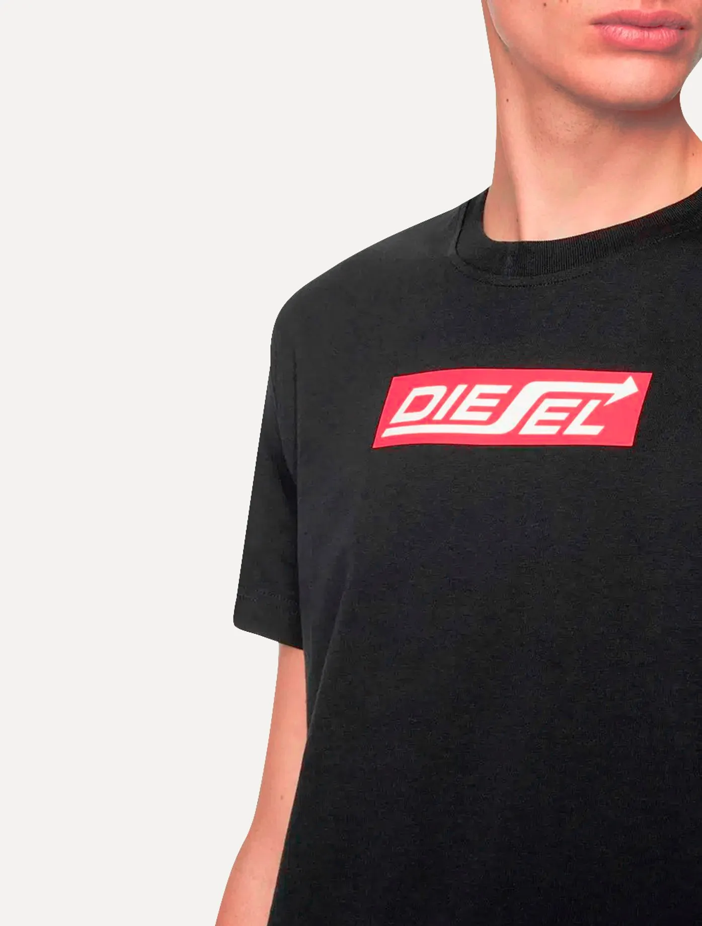 Logo Diesel estampado na altura do tórax, nas cores vermelho e branco.